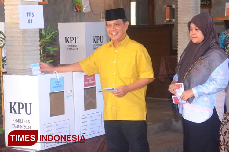 Calon Bupati Malang nomor urut 2, Gunawan HS, datang memberikan suaranya di TPS 007 Dusun Murcoyo, Desa Gondanglegi Wetan, Kecamatan Gondanglegi, di hari pemungutan suara ...