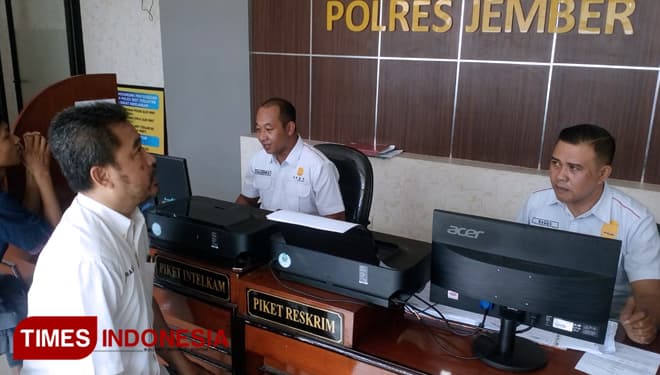 TIMES Bulungan/Wakil Ketua Bidang Litbang dan IT DPD Partai Perindo Kebupaten Jember, Ahmad One Prastiono saat melaporkan Ketua DPD Partai Perindo Kabupaten Jember Hanung Prijobodo ke Polres Jember, Senin (6/5/2019). (FOTO: Dody Bayu/TIMES Indonesia)